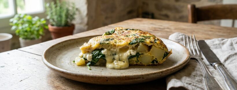 L’utilisation de pommes de terre déjà cuites est l’astuce maîtresse pour gagner un temps précieux lors de la préparation. Elles apportent une consistance fondante qui plaît particulièrement aux enfants et permet de structurer la tortilla. Les épinards offrent un apport végétal intéressant ; s’ils sont frais, ils réduisent rapidement à la chaleur, mais la version surgelée fonctionne tout aussi bien à condition de bien les égoutter pour ne pas détremper la préparation.