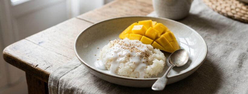 Ce dessert s’appelle souvent khao niao mamuang, et il repose sur une alliance simple : mangue juteuse et riz coco. Pour que la magie opère, une proportion reste la plus fiable : 200 g de riz gluant pour 400 ml de lait de coco au total. Le riz gluant se trouve facilement en épicerie asiatique, et il ne se remplace pas par un riz rond classique : sa richesse en amylopectine donne cette texture collante si caractéristique, sans effet pâteux si la cuisson est bien menée.