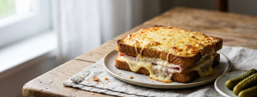 Version végétarienne : ajouter 200 g de champignons poêlés bien égouttés, ou 150 g d’épinards cuits puis très essorés, à la place du jambon. L’important reste de limiter l’eau pour garder la dorure. On obtient un croque fondant et gratiné qui plaît aussi aux enfants dès 2 ans, avec une garniture bien hachée pour une mastication facile.