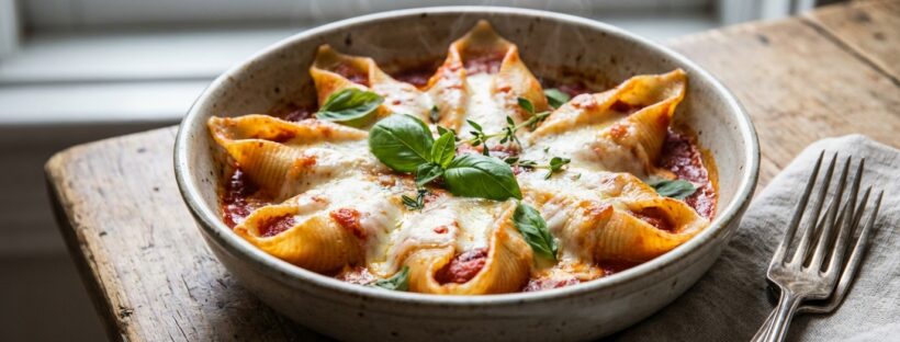 Il suffit d’un plat qui arrive à table, encore bouillonnant, pour que l’ambiance change tout de suite. Au printemps, quand les journées s’allongent, les envies se font plus vertes, plus fraîches, mais toujours bien gourmandes. Et ces coquilles géantes ont exactement ce talent : elles cachent une farce douce et crémeuse que personne ne devine au premier regard. À la sortie du four, le dessus devient doré, le fromage file, la sauce tomate enveloppe tout… et les enfants comme les parents se resservent sans hésiter. Le secret, c’est ce mélange ricotta et légumes de saison, glissé au creux des conchiglioni, puis gratiné en à peine 20 minutes. Un plat simple, généreux, et franchement bluffant.