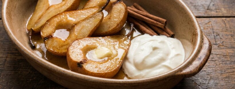 Enfourner le plat à 190 °C pour une durée de 25 à 30 minutes. Placer les bâtons de cannelle sur le plat, au milieu des poires, de manière à ce qu’ils parfument tout l’ensemble. La température est importante : trop élevée, les poires risquent de se dessécher ; trop basse, elles ne caramélisent pas. À 190 °C, la chaleur enveloppe progressivement la chair, la ramollit, tandis que le miel commence à dorer et le beurre crépite légèrement.