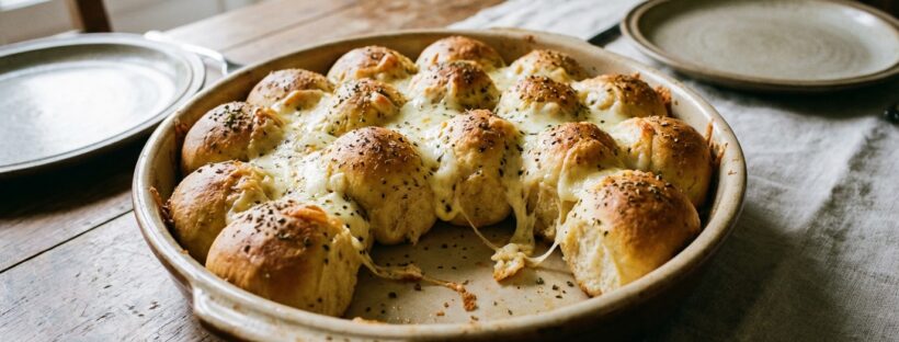 Huiler légèrement un moule, puis déposer les boules joint vers le bas, bien serrées. Ce serrage crée l’effet pull-apart et garde les côtés moelleux pendant que le dessus dore. Ajouter un filet d’huile d’olive, saupoudrer d’origan, et, si envie, un peu de parmesan.