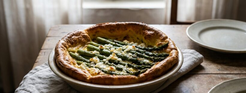 Verser l’appareil sur les asperges et le chèvre, puis enfourner à 180 °C pendant 30 minutes. Le bon repère : un dessus bien doré et légèrement gonflé, avec un centre pris. Si le dessus colore trop vite, une feuille de papier cuisson posée dessus protège sans ramollir.