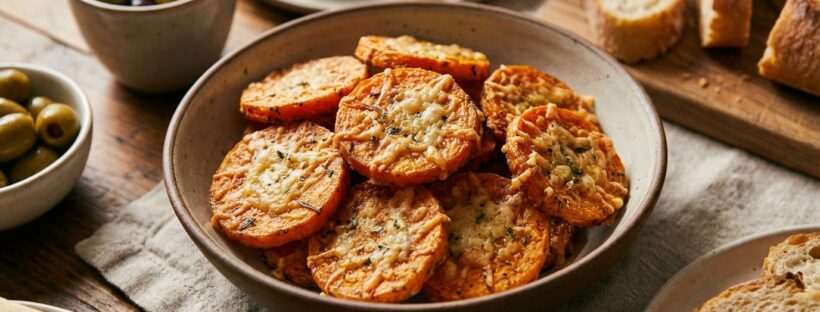 Le fromage, lui, joue le rôle de « moteur » : il fond, puis gratine, et en refroidissant il se fige en une pellicule croustillante qui accroche à la rondelle. Résultat : une chips légère, avec un goût salé juste comme il faut et une texture qui craque sous la dent.