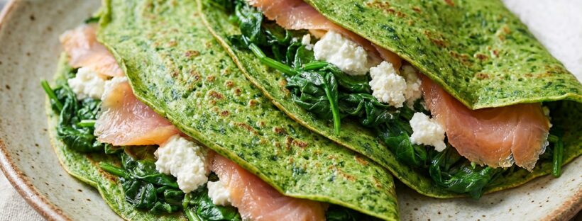 Pour la présentation, ces crêpes vertes adorent les formes qui font “waouh” : roulées en petits makis, pliées en triangles, ou en aumônières avec un brin de ciboulette. L’effet graphique et la texture toute tendre donnent envie d’en reprendre.