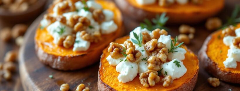La patate douce s’invite au cœur de l’automne, juste avant les premiers frimas de novembre, avec sa chair orangée, douce et délicatement sucrée. Sa texture moelleuse la rend parfaite pour des toasts enfants-compatibles : ici, pas de miettes ni de croûtes dures, tout le monde peut croquer sans crainte. Pour accompagner, un fromage de chèvre frais apporte une touche acidulée équilibrant la douceur du tubercule, tandis que les noix, hachées menu, viennent flatter le palais d’un croustillant inattendu, même chez les petits dès qu’ils savent mâcher correctement.